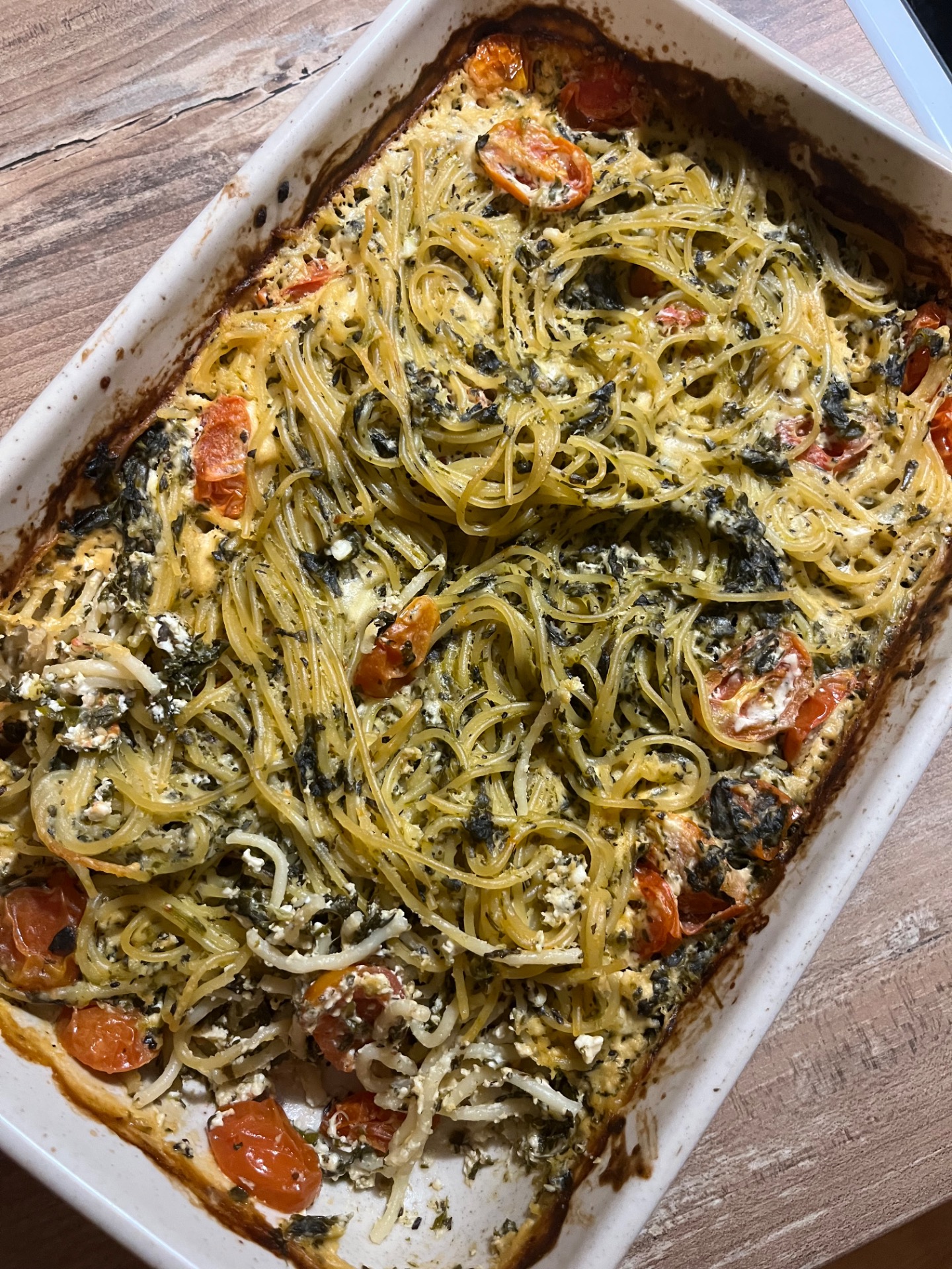 Do pekáčku nebo zapékací misky dej neuvařené špagety a zalij je vodou tak, aby byly ponořené. Na to dej přepůlená cherry rajčata, mražený špenát a feta sýr. Zakápni olejem, osol a posyp třeba kořením na těstoviny. Takhle tu šupni do trouby a jen občas zkontroluj, že se ti to nepálí… Po nějaké době to promíchej a zjisti, jestli už jsou špagety hotové…